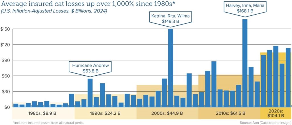 Average insured catastrophe losses have been on the rise for decades, reflecting a combination of climate-related factors and demographic trends as more people have moved into harm’s way.